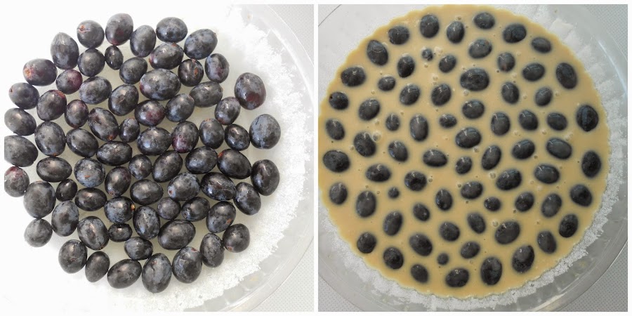 Colocamos las uvas en el molde para horno y volcamos la masa dentro de él.