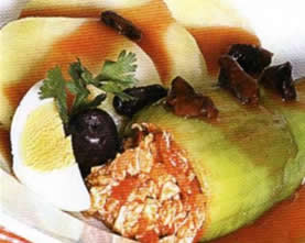 Retire del fuego, añada el pan exprimido y triturado, huevo crudo y perejil, mezcle, agregue huevo sancochado picado, aceitunas y pasas, rellene las caiguas con esta preparacion, ponga encima una tajada de queso y tape con el extremo ancho de la caigua.