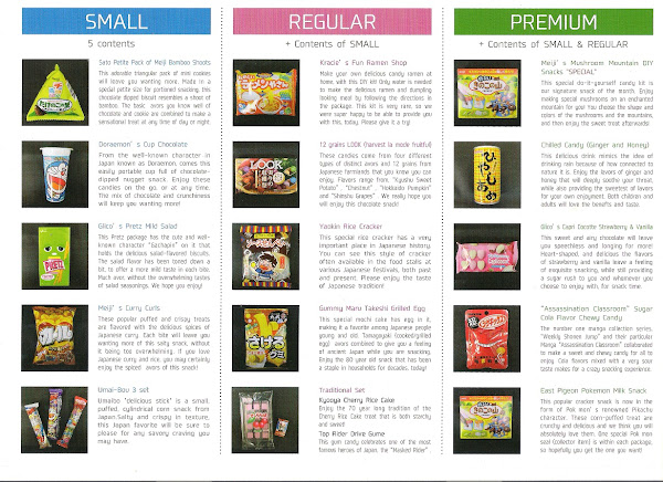 Caja Regular: una caja muy variada donde encontrarás de 8 a 12 snacks y/o dulces de tamaño completo, junto con kit dulce de Sushi. Tiene un un precio de $24.99 al mes.