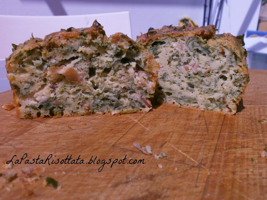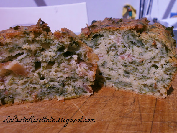 Batir los huevos y ,sin dejar de batir, agregar la harina y el polvo de hornear. También agregue el vino blanco, el queso parmesano y aceite de oliva. Cortar la rucula con las manos y cortar el tocino en trozos pequeños y añadirlos a la masa. Añadir sal y pimienta. Verter la mezcla en un molde de cake forrado con papel de horno y hornear; cocer durante unos 50 minutos.
