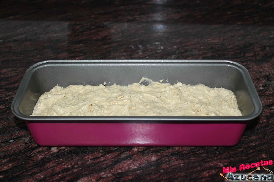 Cogemos el molde y ponemos toda la masa, una vez tengamos toda la masa en el molde le daremos unos golpecitos sobre la encimera para que nos queden huecos y se reparta bien la masa, metemos en el horno y lo dejaremos entre 70 y 75 minutos.