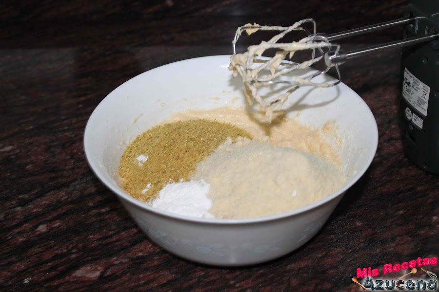 Por último añadiremos los pistachos que tenemos picados, la almendra y la levadura, volvemos a mezclar todo bien hasta que todos los ingredientes este bien integrados.