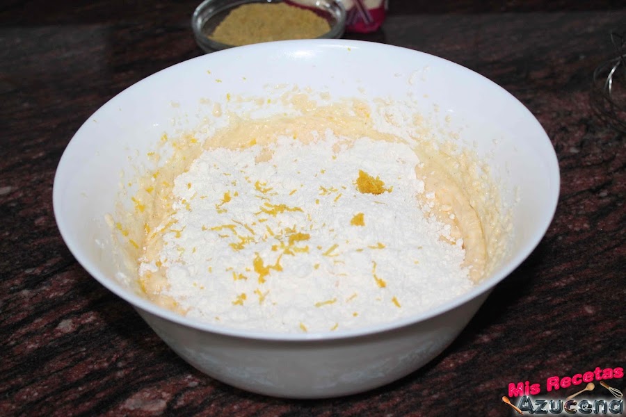Cuando tengamos todos los huevos incorporados sobre este mismo bol tamizaremos la harina y también añadiremos la ralladura de un limón, seguimos mezclando todo bien.
