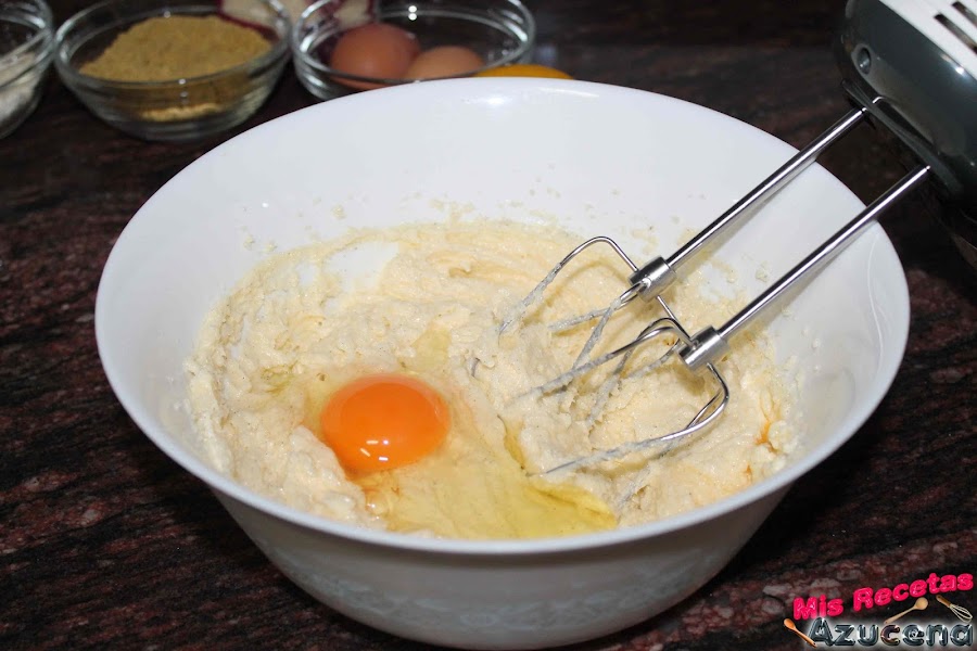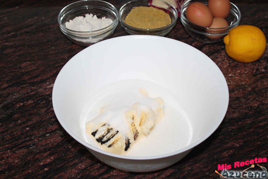 En un bol pondremos la mantequilla junto con el azúcar y las semillas de la vaina de vainilla, para sacar las semillas de la vaina la abriremos por la mitad y con la punta de un cuchillo rasparemos el centro, con ayuda de unas varillas batiremos bien, cuando tengamos los dos ingredientes bien mezclados iremos añadiendo los huevos de uno en uno, mientras el primero no esté bien integrado no añadiremos el siguiente.