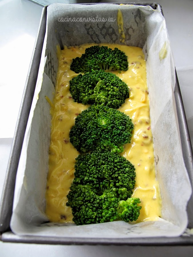 Untamos nuestro molde con un poco de mantequilla, lo forramos con papel de hornear y vertemos nuestra preparación. Colocamos los ramilletes de brócoli, como si fueran arbolitos.