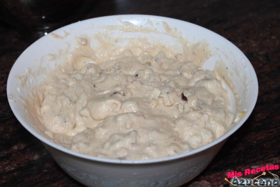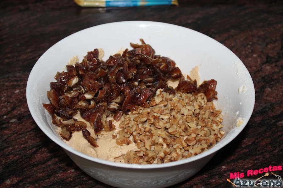 Ahora añadimos los dátiles y las nueces, dejamos las varillas y con ayuda de una lengua o cuchara mezclamos todo bien hasta que se integren todos los ingredientes.