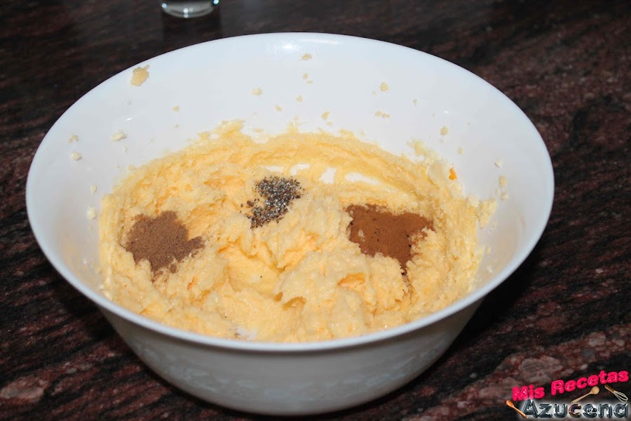 Después a esta mezcla la ponemos las especias, el jengibre y la sal, volvemos a batir todo bien para a continuación añadir la leche y seguimos batiendo.