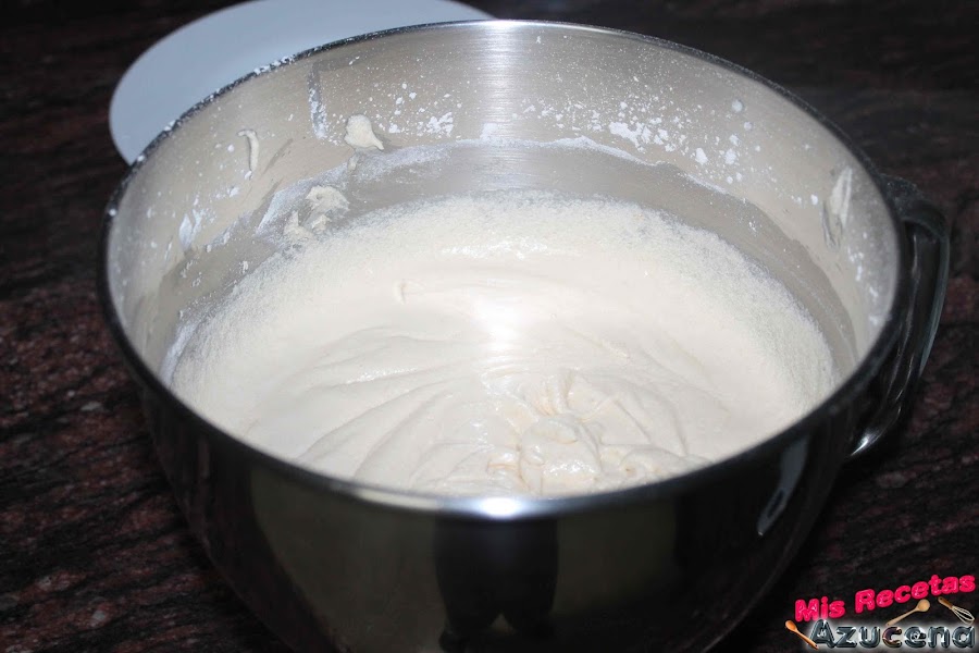 Continuamos añadiendo la nata (crema de leche) y la harina con la levadura que ya tenemos tamizada, seguimos batiendo hasta que estén todos los ingredientes bien mezclados.