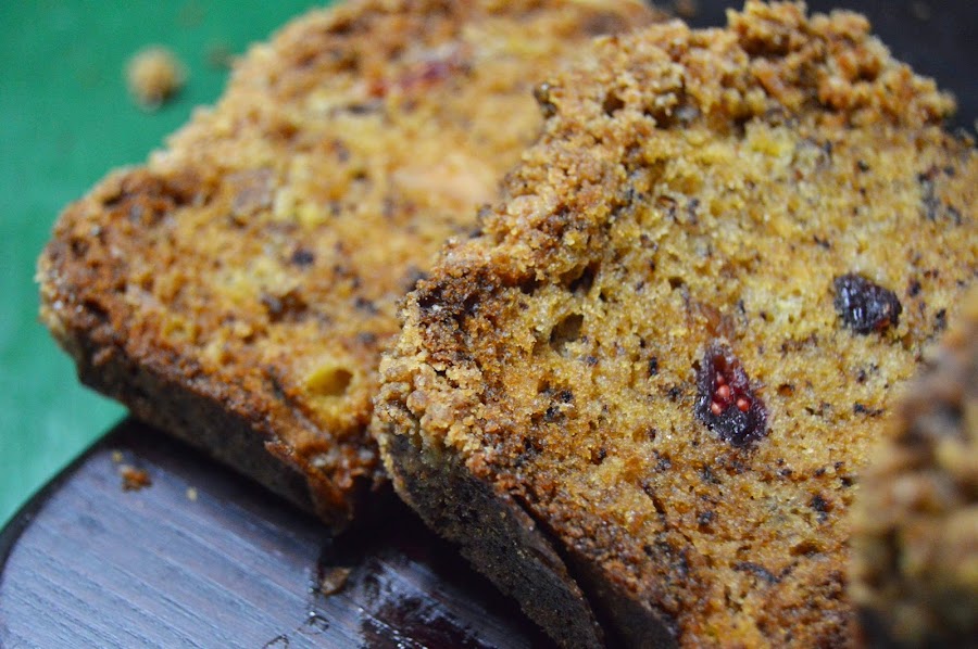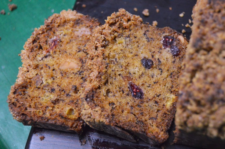 Los ingleses le llamarían Cinnamon streusel almond cranberry banana bread, me hace mucha gracia una frase tan larga y sin ningún conector, solo nombres.