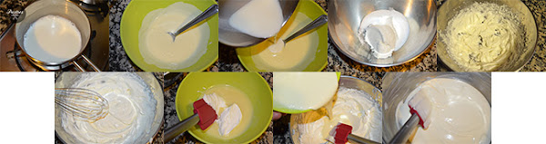 En otro bol semimontamos la nata (crema de leche). Ahora añadimos la crema de queso a la ganache (la mezcla de leche y chocolate blanco), la vamos integrando poco a poco con movimientos envolventes hasta conseguir una crema lisa. Finalmente le vamos añadiendo la nata (crema de leche) semimontada a intervalos, también con movimientos envolventes, tapamos con film y dejamos reposar en la nevera para que coja consistencia.