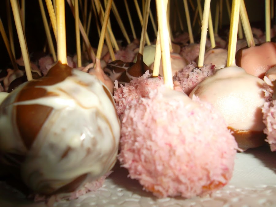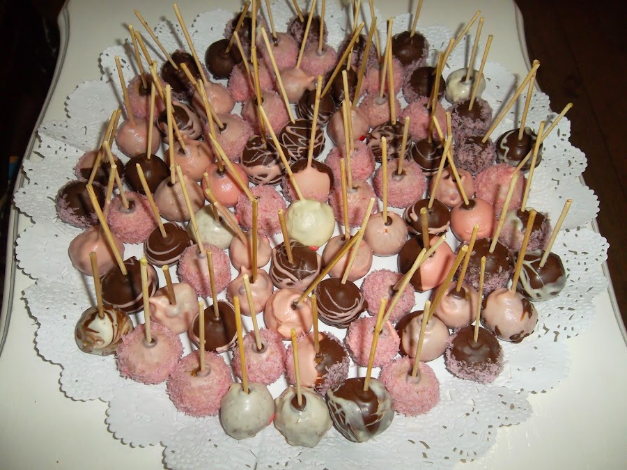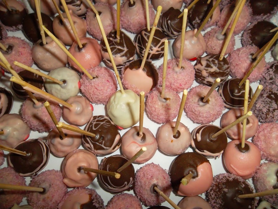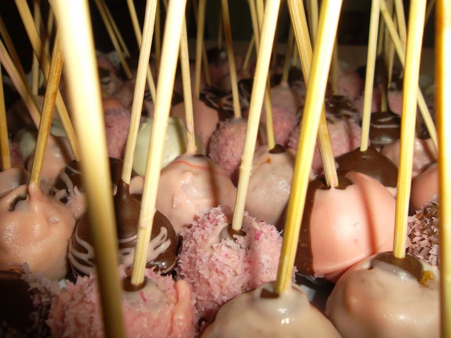 Untar la punta del cada palito o brocheta con el chocolate e inmediatamente, uno a uno, ir pinchando las bolitas con el mismo....