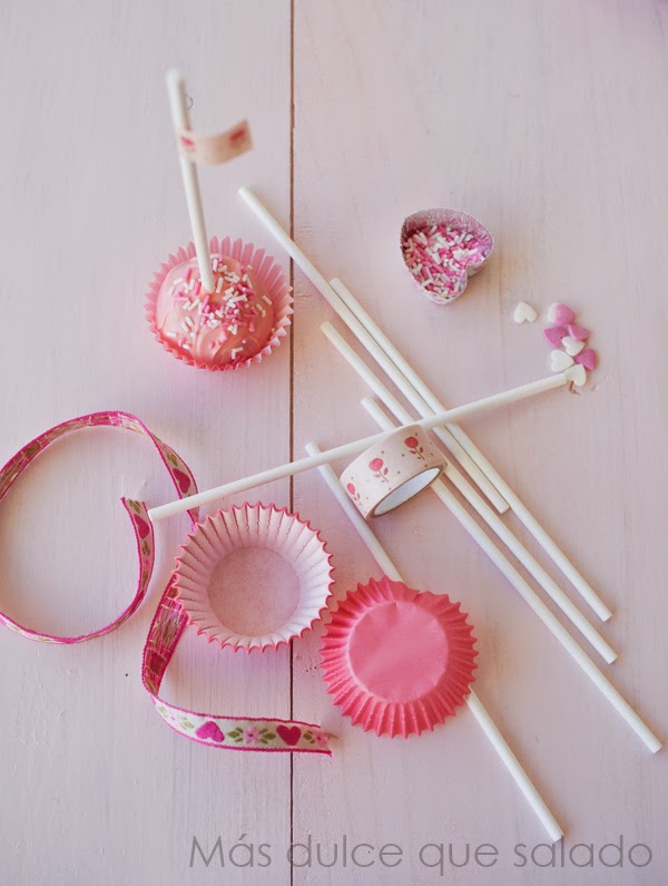 De nuevo os traigo una propuesta para el día de los enamorados. Bueno, en realidad son unos cake pops que se pueden hacer en cualquier momento, pero si usas un bizcocho rosa ( con sabor a chicle), los cubres de rosa y los espolvoreas con corazones o confeti rosa , se convierten en unos cake pops muy románticos.