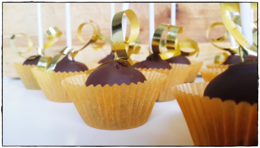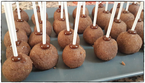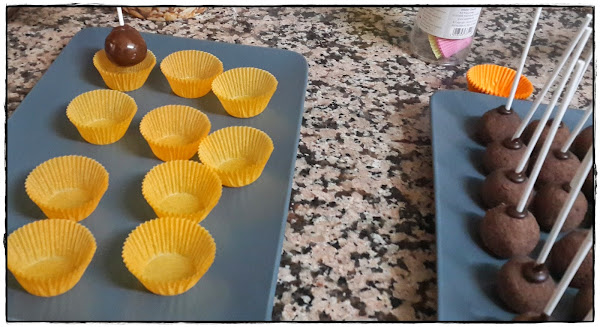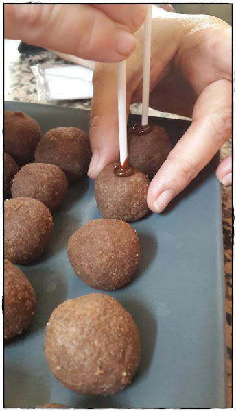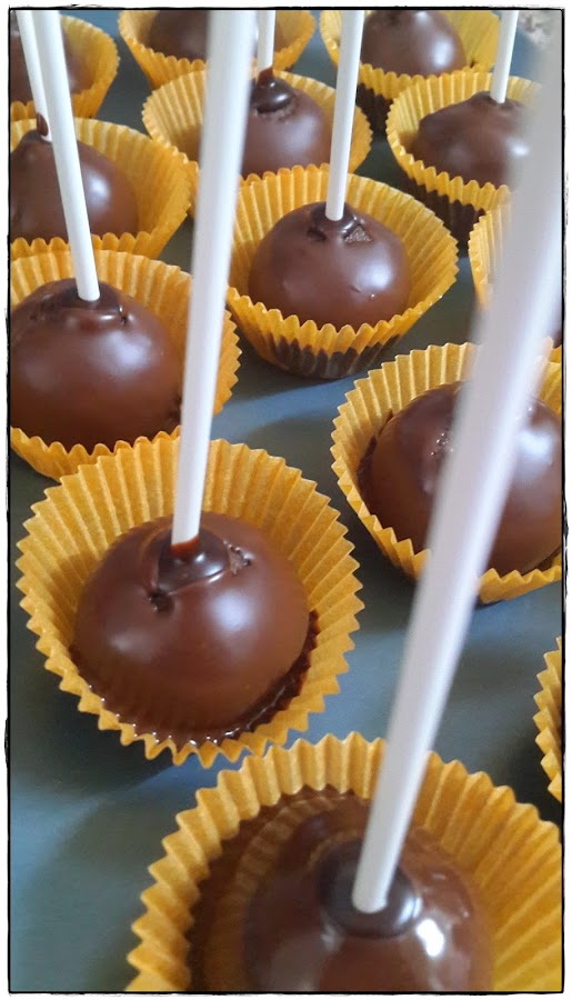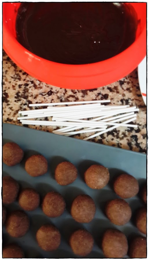 Cuando ya está frío y endurecido el chocolate, volvemos a calentar el chocolate y cuando este entre calentito y enfriado cogemos los cake pops por el palillo y haciendo giros los los dedos bañamos la bola hasta que este totalmente cubierta,