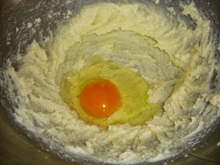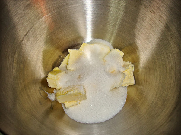 En un bol se pone la mantequilla con el azúcar y se bate hasta que la mezcla sea homogénea y mas clara, luego se introduce los huevos uno a uno y se sigue batiendo.