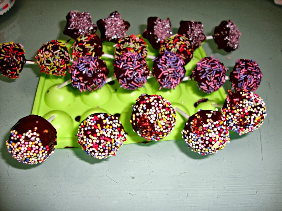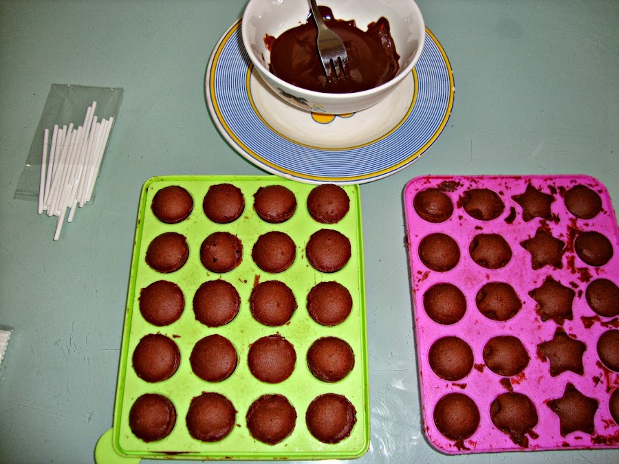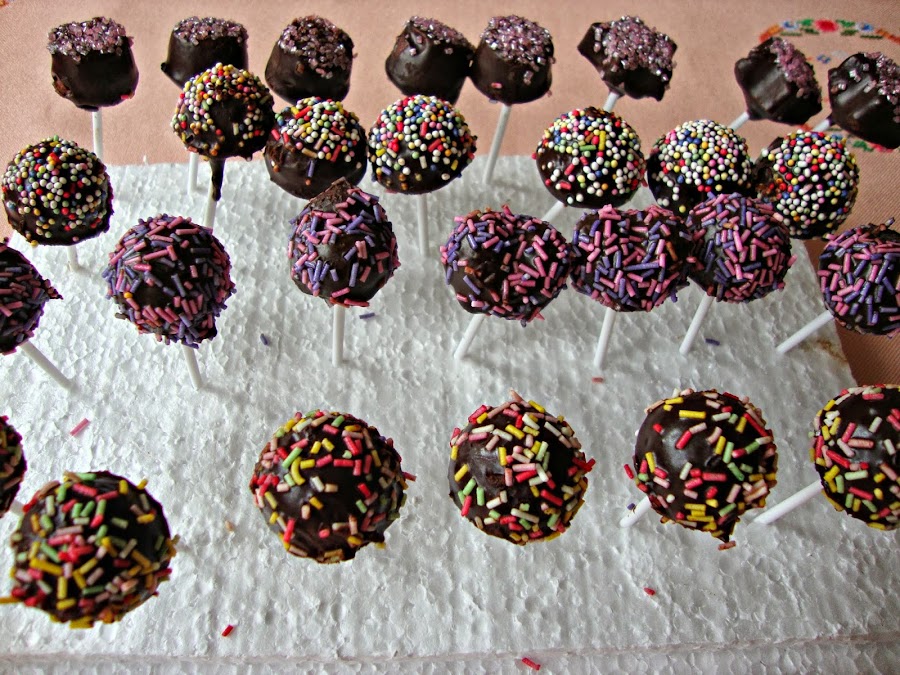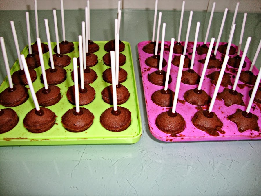 Una vez fríos se funde un poco de chocolate al microondas o al baño María y se moja el palito en la mezcla y se clava en el centro del cake pop.