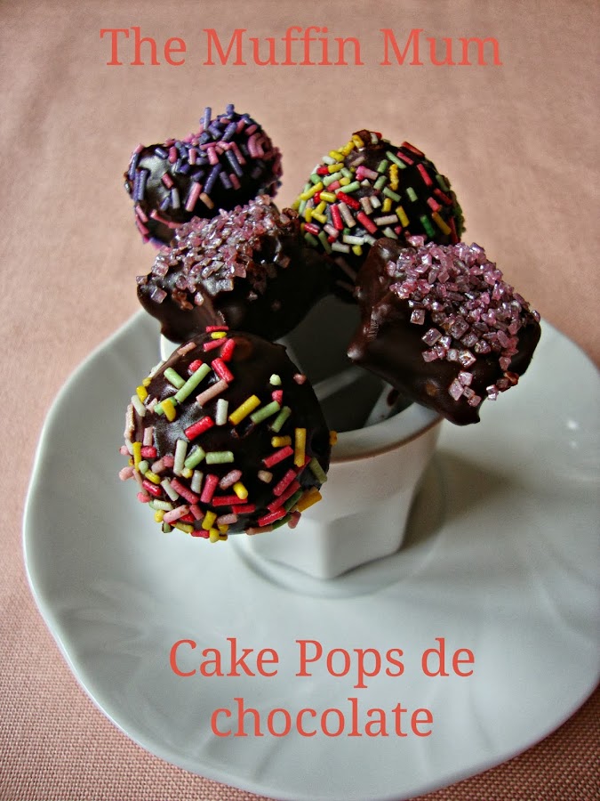 Para la cobertura yo he usado ganache de chocolate negro. Una vez fríos los cake pops se bañan en el ganache (para ayudarnos a mojar por donde el palito nos ayudamos de una cuchara), se deja escurrir un poco y luego se le dan unos golpecitos sobre la mano para quitar bien en sobrante y se dejan secar un poco. Finalmente se le ponen los topping que queramos y guardamos en el frigorífico para que se enfríen totalmente.