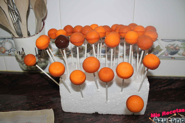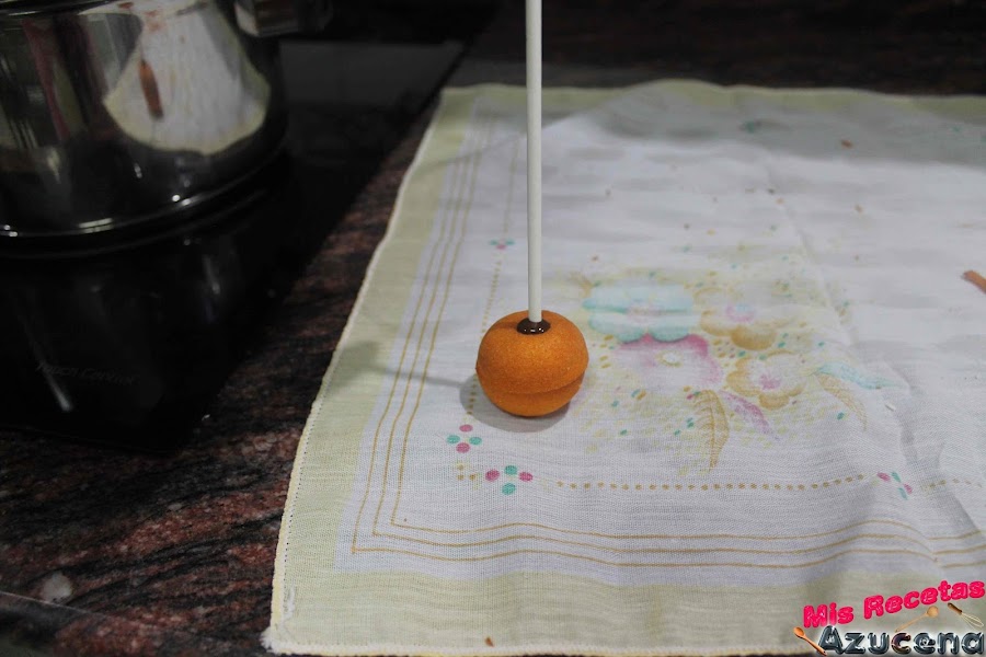 Cuando la bolas estén frías derretiremos un poco de chocolate en el microondas, cogemos los palos para los cake pops y los mojamos en chocolate y los introducimos hasta la mitad de la bola, esto lo haremos con todas las bolas introducimos en la nevera y dejamos que endurezca el chocolate.