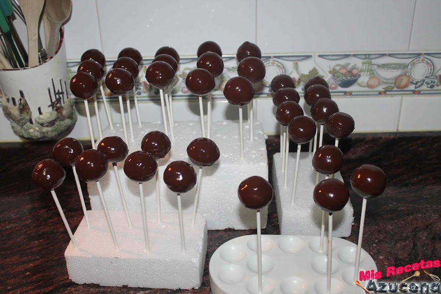 Una vez tengamos el chocolate derretido apagamos el fuego pero no retiraremos la olla del mismo para que con el calor residual mantenga el chocolate derretido, removemos un poco, cogemos cake pops y lo introducimos en el chocolate, le damos vueltas para cubrirlo bien de chocolate, lo sacamos y lo dejamos escurrir un poco antes de pincharlo verticalmente en un trozo de poliespan, estos pasos los repetiremos con todos hasta terminarlos todos.