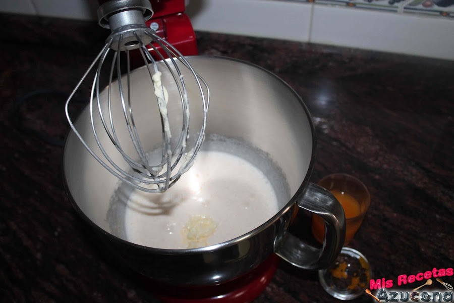 Ahora añadiremos a la masa el zumo de naranja y la ralladura mezclamos bien.