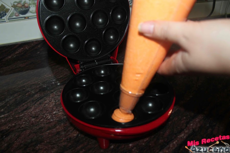 Una vez tengamos todos los ingredientes bien mezclados cogeremos una manga pastelera y le pondremos una boquilla redonda, la rellenamos con toda la masa y ponemos a calentar nuestra máquina de cake pos.