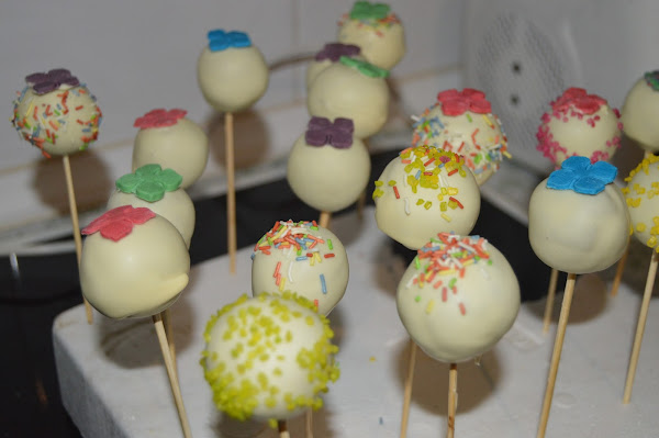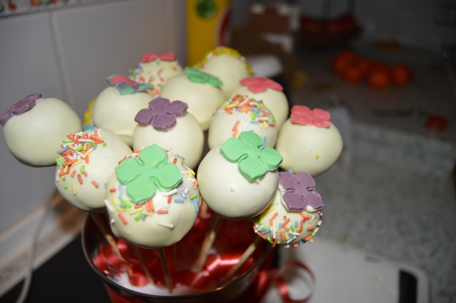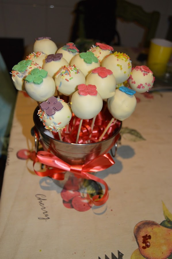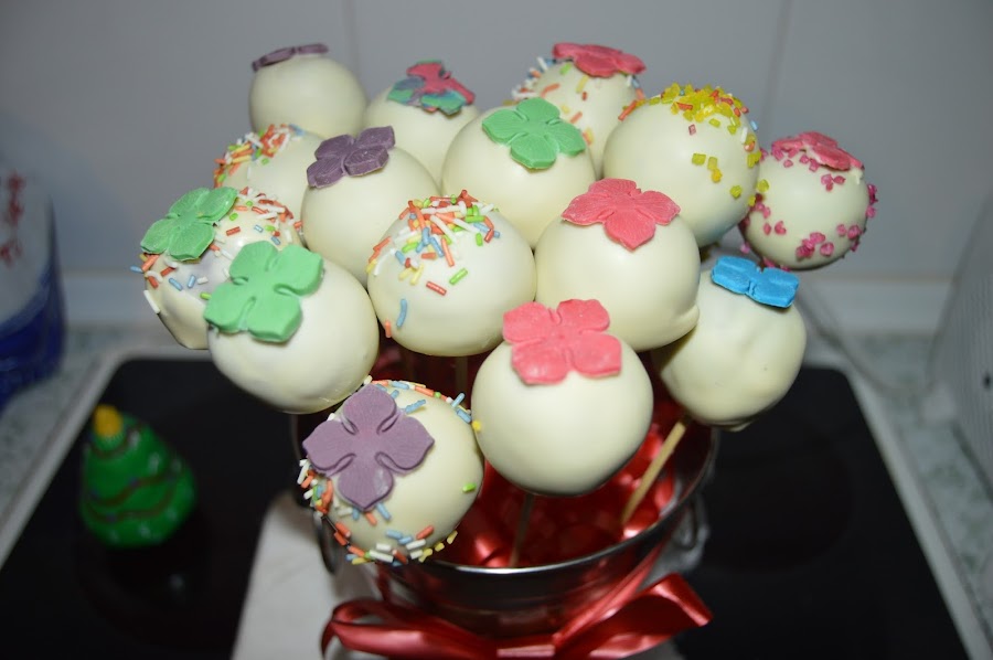Hoy os enseño como hacer el postre que le hice a mi hermano por sus 18 años, le hice 18 cake pops con lo que me sobró de red velvet bañados en chocolate blanco y decorados con una flor de fondant.