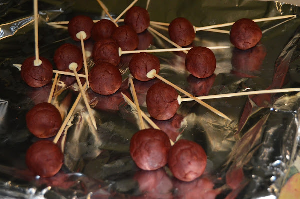 Metemos la punta del palito en el chocolate blanco e insertamos una en cada bolita.