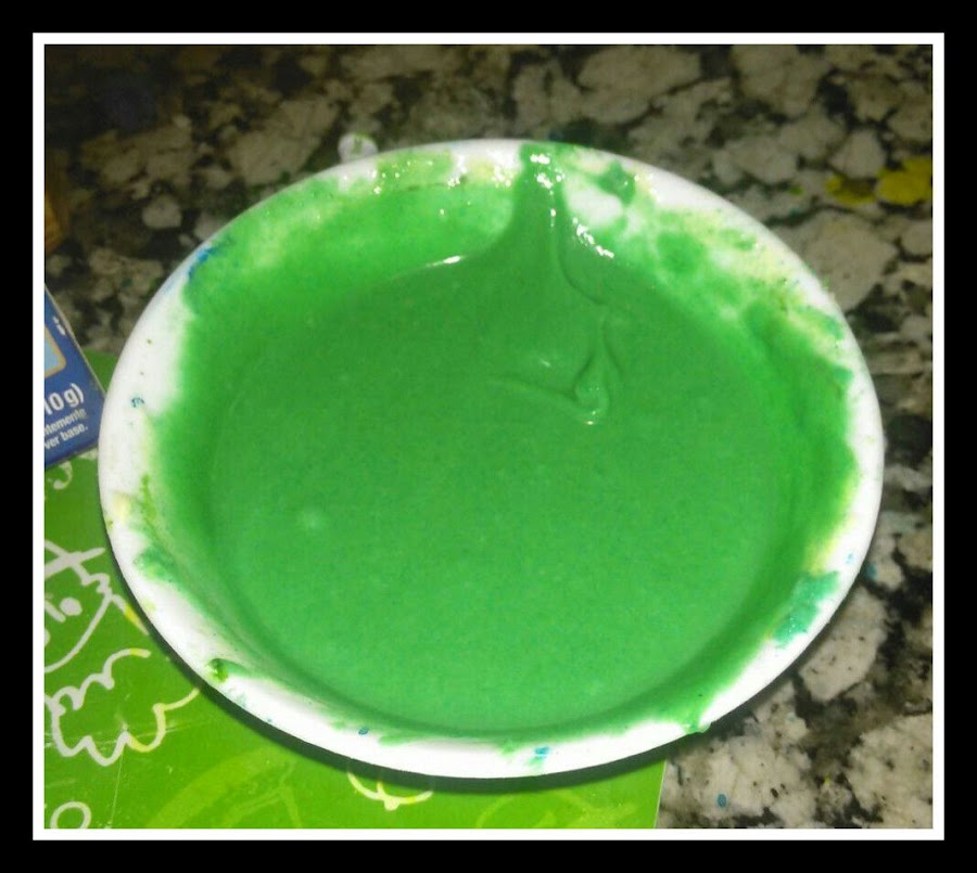 Fundimos el chocolate en el microondas en intervalos de 30 en 30 segundos. Teñimos de verde si vemos que es espeso añadimos un poco de aceite de semillas. Ha de quedar bastante líquido.