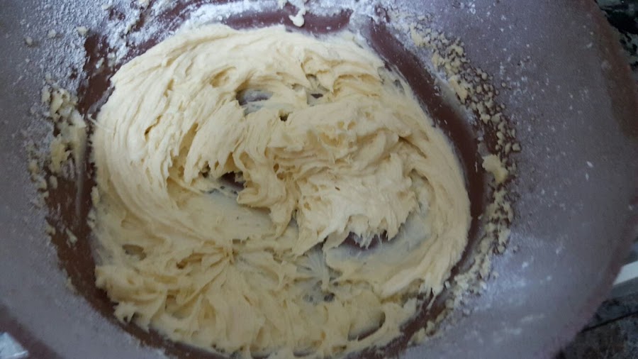 Una vez frío lo desmigamos y añadimos el queso crema y el azúcar glas, vamos mezclando hasta obtener una masa que no se pegue.