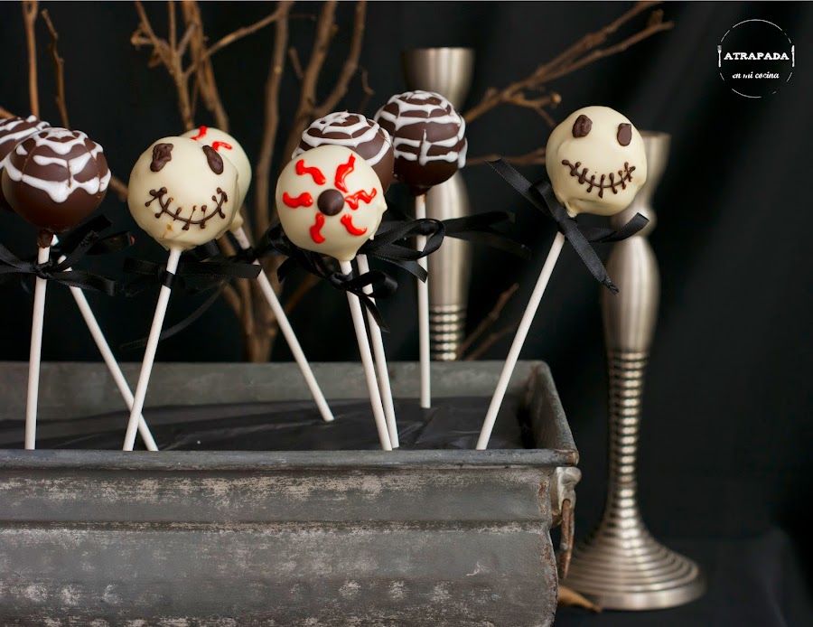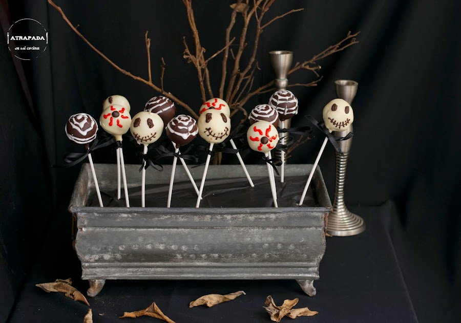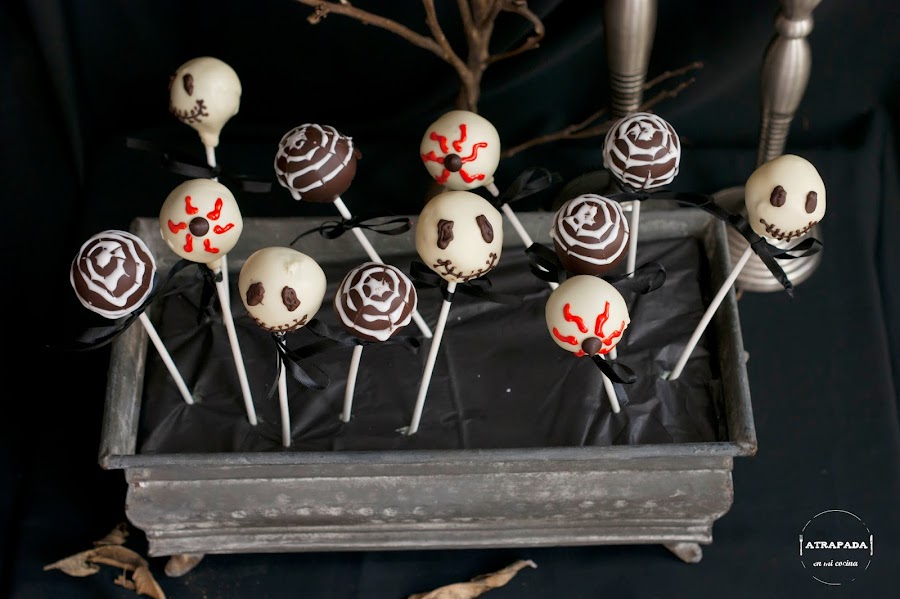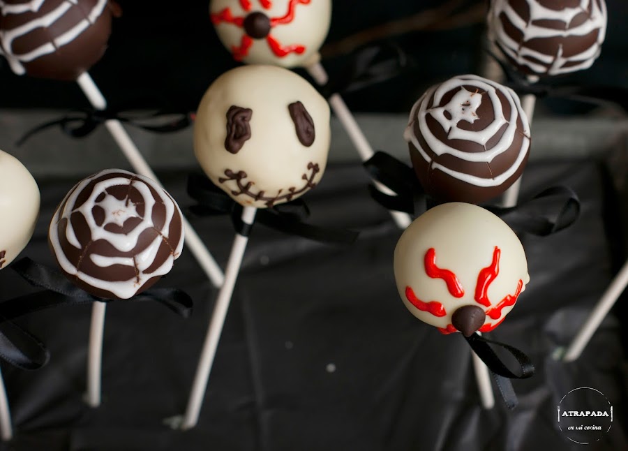 Este blog y su autora, yo misma, nos comprometemos a no volver a hacer ninguna receta más de Halloween hasta el año que viene......Ha sido una semana repleta de recetas especiales para la celebración de Halloween, y con ellas quería aportar algunas ideas, ya que llegando estos días los niños quieren vivir plenamente esta festividad (importada, ya lo se.....). La comida es una gran forma de representar las épocas por las que pasamos y por suerte podemos convertirla en cualquier cosa para darle otro aspecto. Quería aprovechar los restos del bizcocho de chocolate que usé para el bizcocho que os enseñaba ayer y se me ocurrió preparar unos cake pops. No quería hacerlos nada complicados ni usar ingredientes extraños que no estén al alcance de todos. Y así ha sido, salvo un poco de colorante rojo, todos los demás ingredientes podemos comprarlos en cualquier super. Tampoco tengo ningún molde especial para hacer los cake pops, sino a mano le doy la forma, por lo que se convierten en una excusa perfecta para poder disfrutar en la cocina con los niños la elaboración de estos cake pops. Éstos son sólo cuestión de práctica, y siguiendo una serie de pasos básicos seguro que os quedan perfectos.