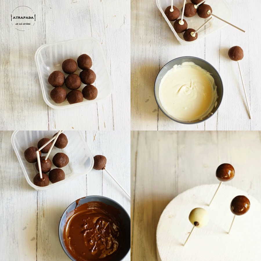 Desmenuzamos el bizcocho y mezclamoss junto con la Nutella hasta que veamos que podemos hacer bolas facílmente, que queden compactadas. Vamos haciendo bolas del mismo tamaño, no muy grandes y metiendo en un táper. Dejamos enfriar unas horas. Si las metemos muchas horas, al sacarlas tendremos que dejarlas a temperatura ambiente un ratito, pues corremos el riesgo de que se hayan enfriado más de la cuenta y se rajen al meter el palito. Antes de meter el palito hay que derretir el chocolate al baño María o a golpes de microondas, cuidando que no se queme. Mojamos el palito en chocolate (yo la mitad negro y la otra chocolate blanco) y clavamos en la bola de bizcocho con cuidado. En algunos de los de chocolate blanco pegaremos una gota de chocolate. Metemos en el frigorífico unos quince minutos hasta que se endurezca el chocolate (esto evitara que después la bola se despegue del palito). En ese momento el chocolate estará perfecto para cubrir nuestras bolas. Vamos sacando una a una y cubriéndola totalmente de chocolate, unas de chocolate blanco y las otras de chocolate negro.. Le damos unas vueltas para que suelte el exceso de chocolate y quede lo más liso posible sobre el bizcocho. Una vez que haya soltado el exceso de chocolate pinchamos sobre una base de porexpan nuestro cake pop o ponemos en un vaso o en un soporte especial para cake pops.