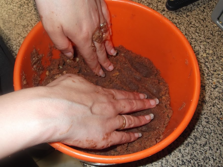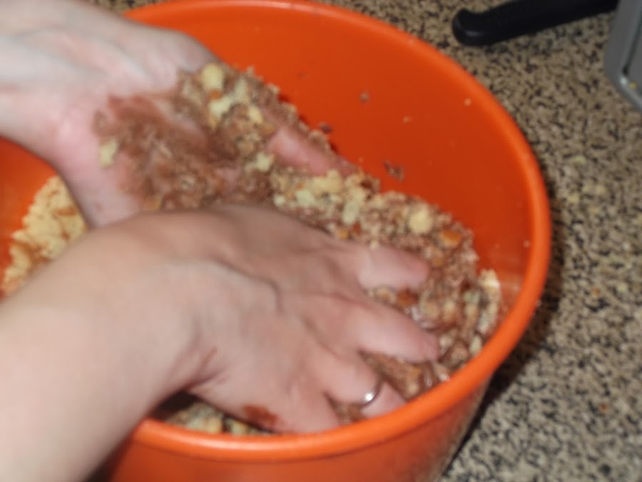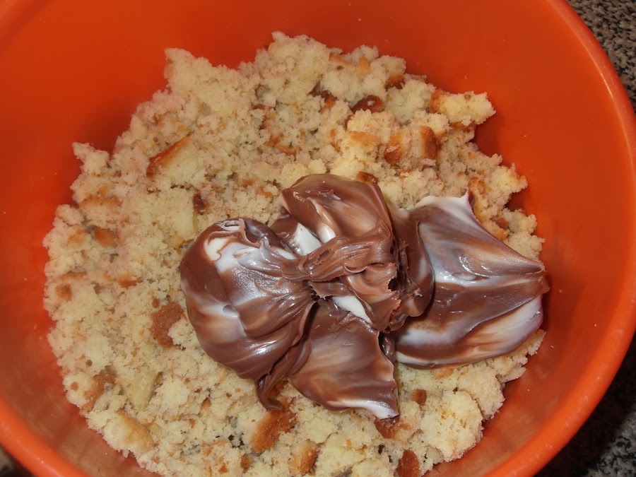 Lo primero que hacemos es demigar el bizcocho, si tenéis niños en casa esto es un trabajo especial para ellos, si no os tocará a vosotros. No obstante, es una buena terapia contra el estrés. Una vez que lo tenéis todo bien desmigado, no vale hacer trampa, añadís las cinco cucharadas de nutella para que se pegue la masa con el bizcocho, en vez de nutella si utilizáis un bizcocho de chocolate o pensáis que os puede quedar demasiado empalagoso podéis utilizar queso mascarpone o Philadelphia.