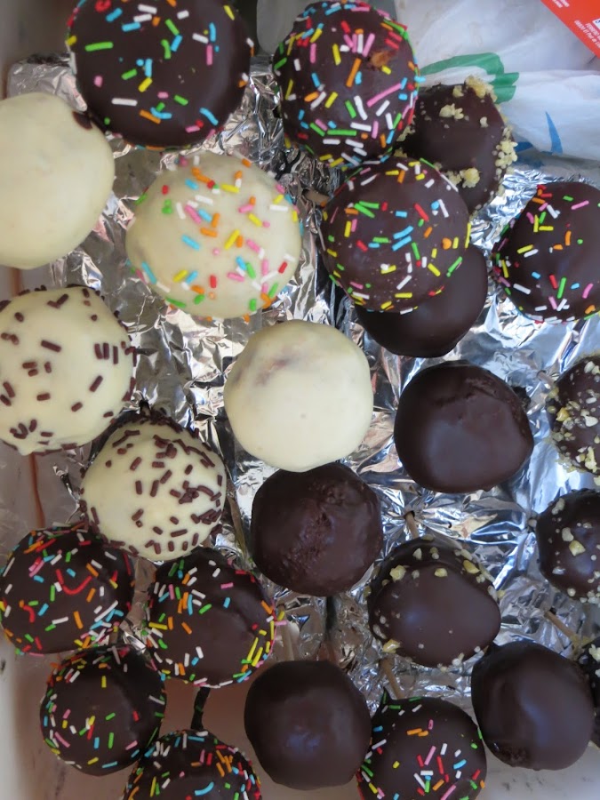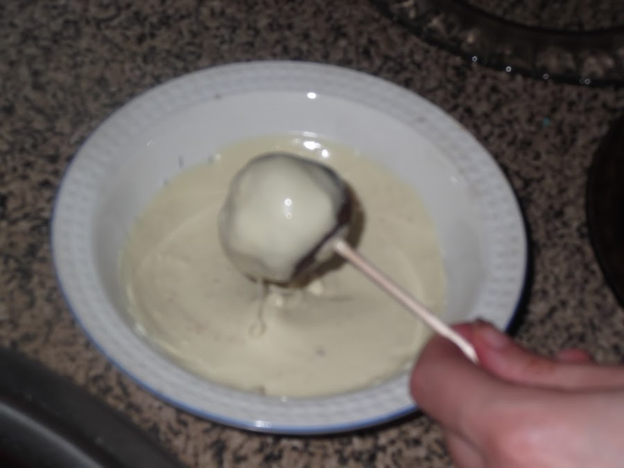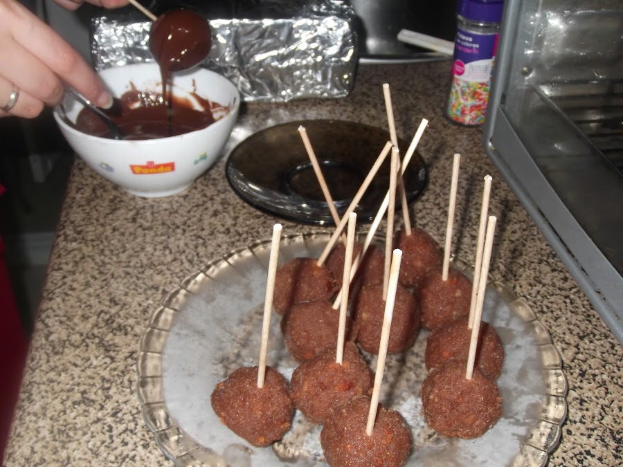 Pasado este tiempo las sacáis y le vais clavando el palito, lo ideal es utilizar de piruleta o chupa chups, pero como no encontré utilicé de pincho moruno, los partí por la mitad, los mojé un poco en el chocolate y los introduje un poco en la bola que había hecho de bizcocho. A continuación, los fui mojando uno a uno en el chocolate que había fundido al microondas y luego los decoré con los fideos. Por supuesto no pongáis mucho chocolate o dar un par de golpes en el borde del cuenco para que cuando los pongáis de pie no se caiga todo el chocolate sobrante.