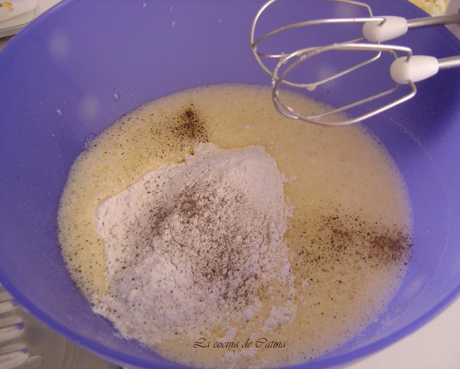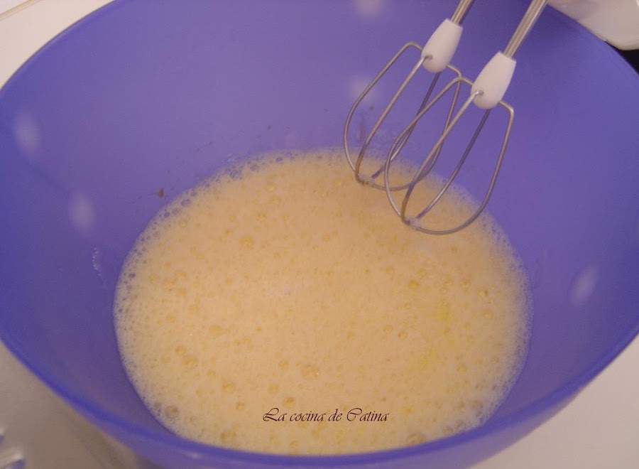 En un bol batimos los huevos, el aceite y la leche durante unos minutos, añadimos la harina mezclada con la levadura y la sal y batir durante unos minutos más.