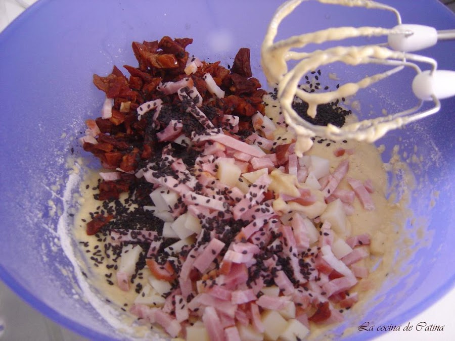 Incorporar al bol el tomate, el queso, el beicon, las semillas de amapola y la pimienta y mezclar bien con una espátula.