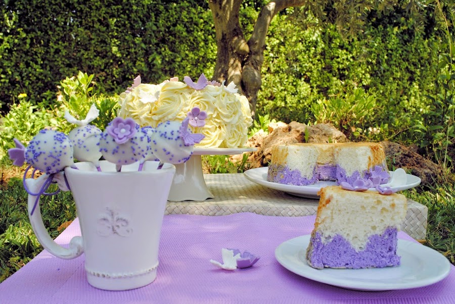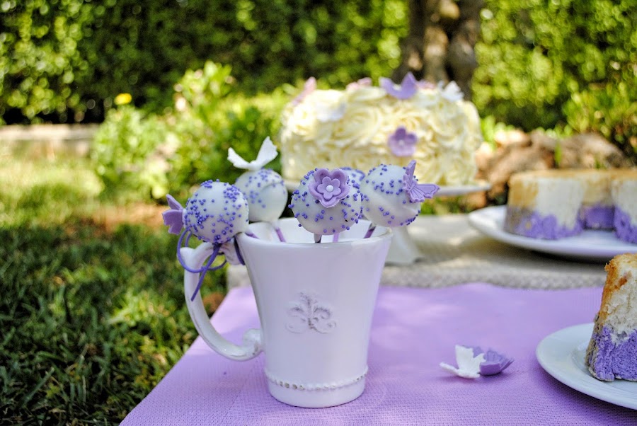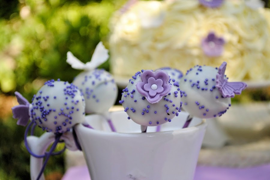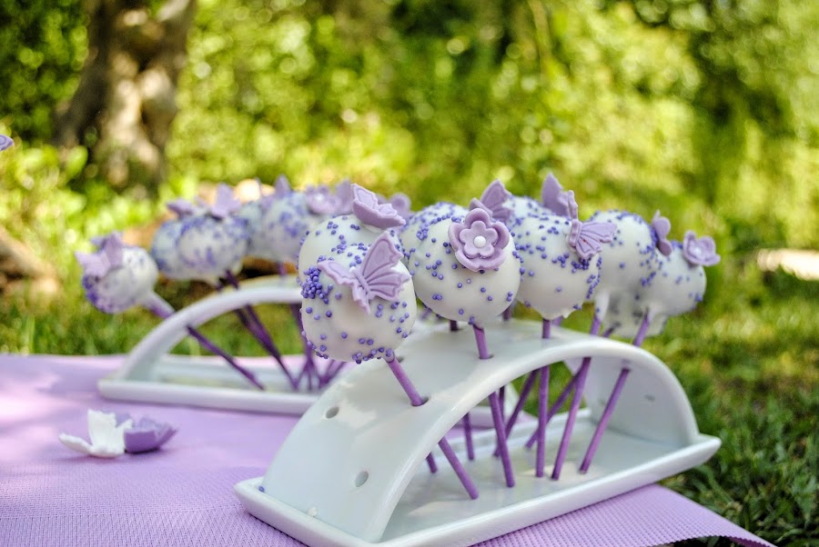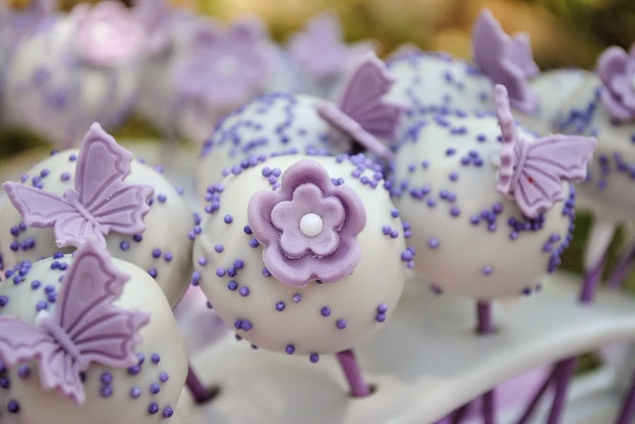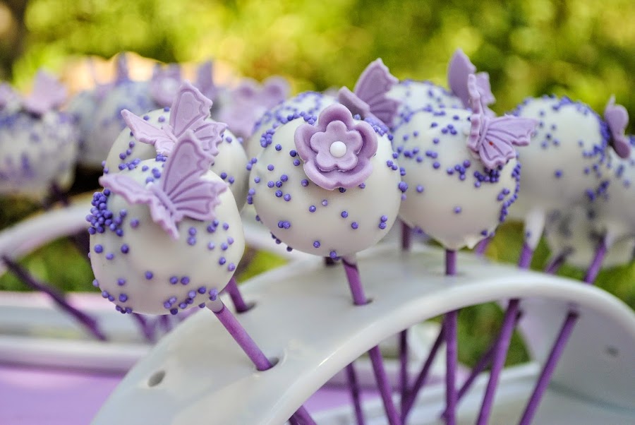 Yo en este caso con un poquito fondant y unos cortadores hice unas mariposas lilas a juego con los palitos y los sprinkles del mismo tono.