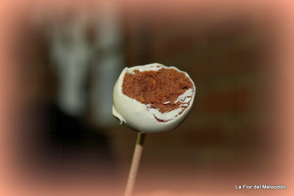 Deshacemos el chocolate en el microondas dando tiempos cortos y poca potencia para que no se queme. Untamos la brocheta en el chocolate y la pinchamos en la bola. Procurad no llegar a más de la mitad de la bola, porque sería más fácil que se escurriera palito abajo. Volvemos a llevarlas a la nevera para que el chocolate se endurezca y haga de "pegamento".