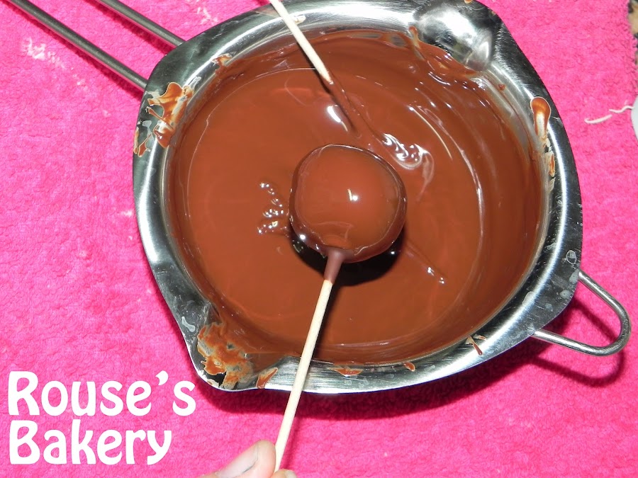 Bañamos las bolas en el chocolate fundido y giramos para quitar el exceso.