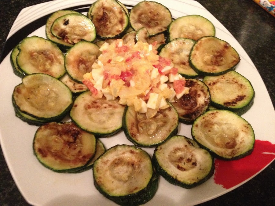 3º - Vamos calentando la plancha y reservamos las rodajas de calabacín para posteriormente pasarlas por la misma .
