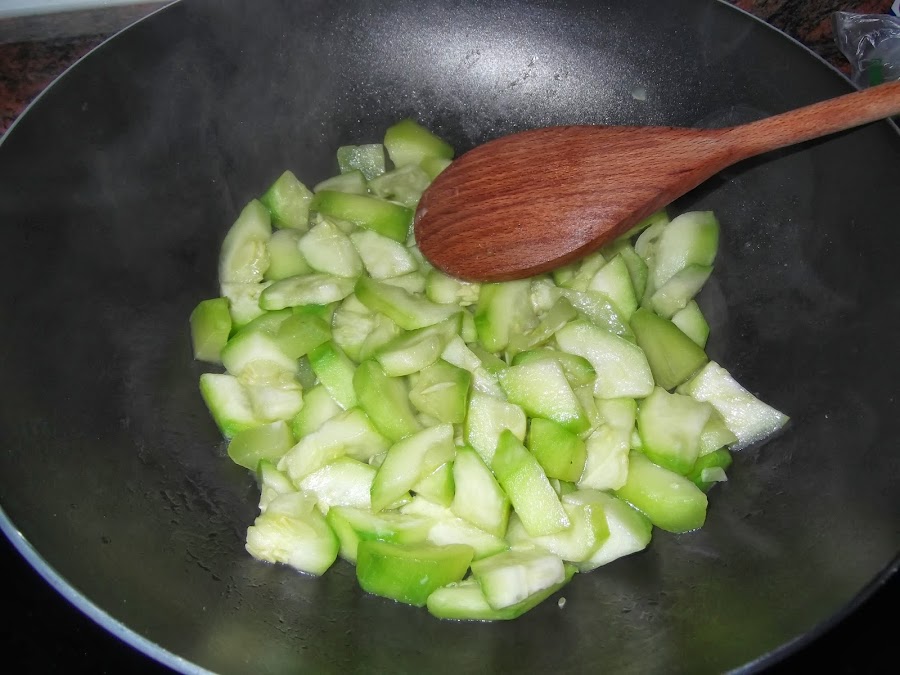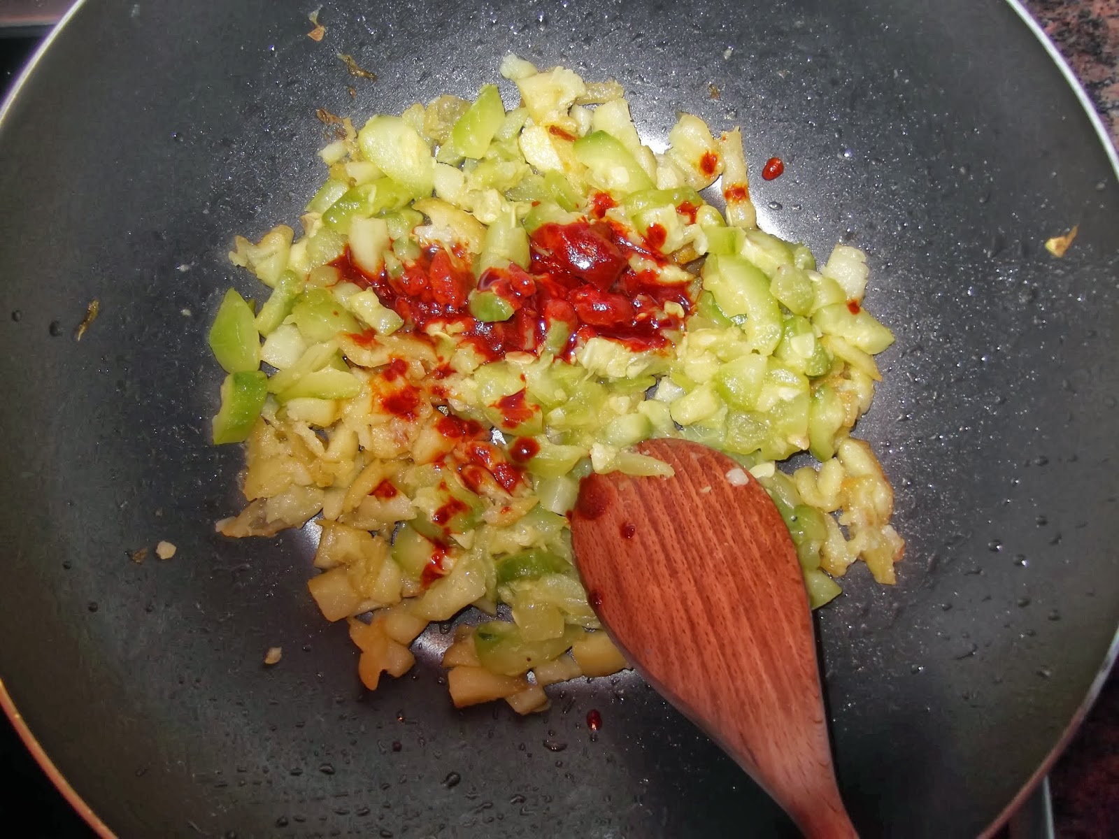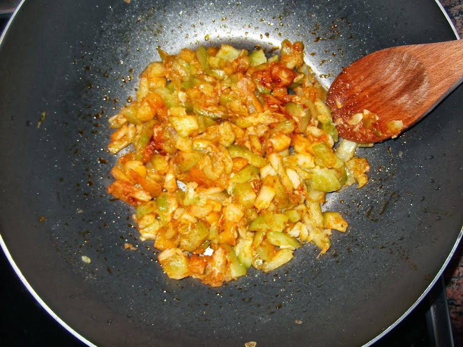 Trocea y pela el calabacín sálalo y comienza a freírlo con muy poco aceite. Si veis que se seca se le añade un poco de agua para que se haga en su jugo. Cuando ya está casi hecho se chafa y se saca un plato. Tardará unos 25 minutos.