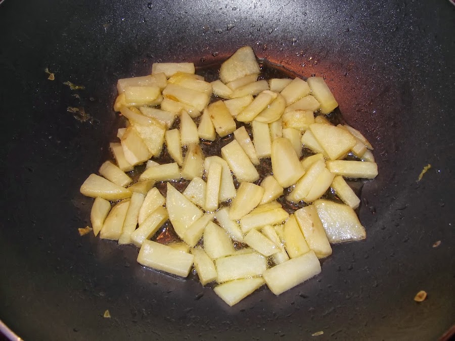 Mientras tanto peláis las patatas y las saláis, en la misma sartén donde se ha cocinado el calabacín, echáis una cucharada de aceite y freís las patatas. Cuando están casi cocinada se chafan las patatas y se le añade el calabacín para mezclar los dos sabores, pero no hay que añadirle más aceite.