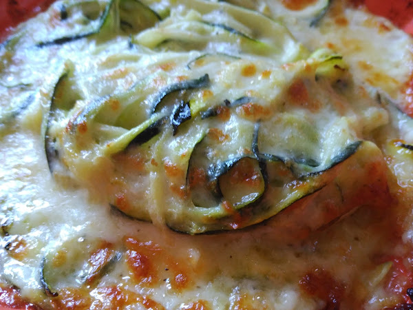 Una manera diferente de comer calabacín, que combina requetebien con el queso fundido, y le damos el toquecillo cortándolos en tiras finitas, como espaguetti.