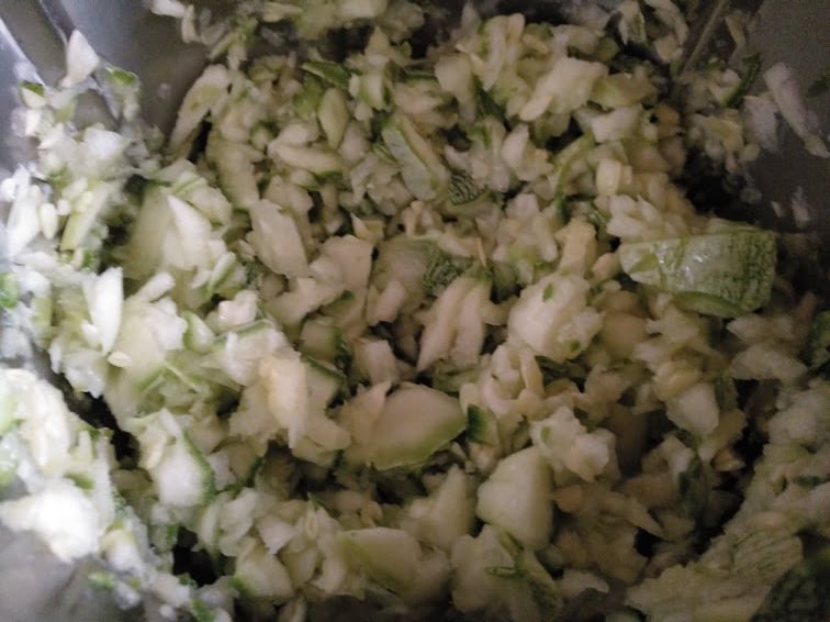 Limpiamos el calabacín y lo cortamos por la mitad a lo largo. Si lo hacemos a mano, tenemos que picarlo finito.