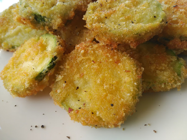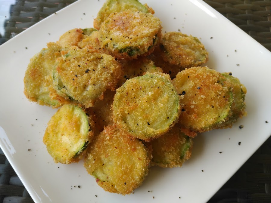 - Vamos pasando las rodajas primero por harina, luego por huevo y finalmente por la mezcla de pan y queso, y freímos en el aceite bien caliente.