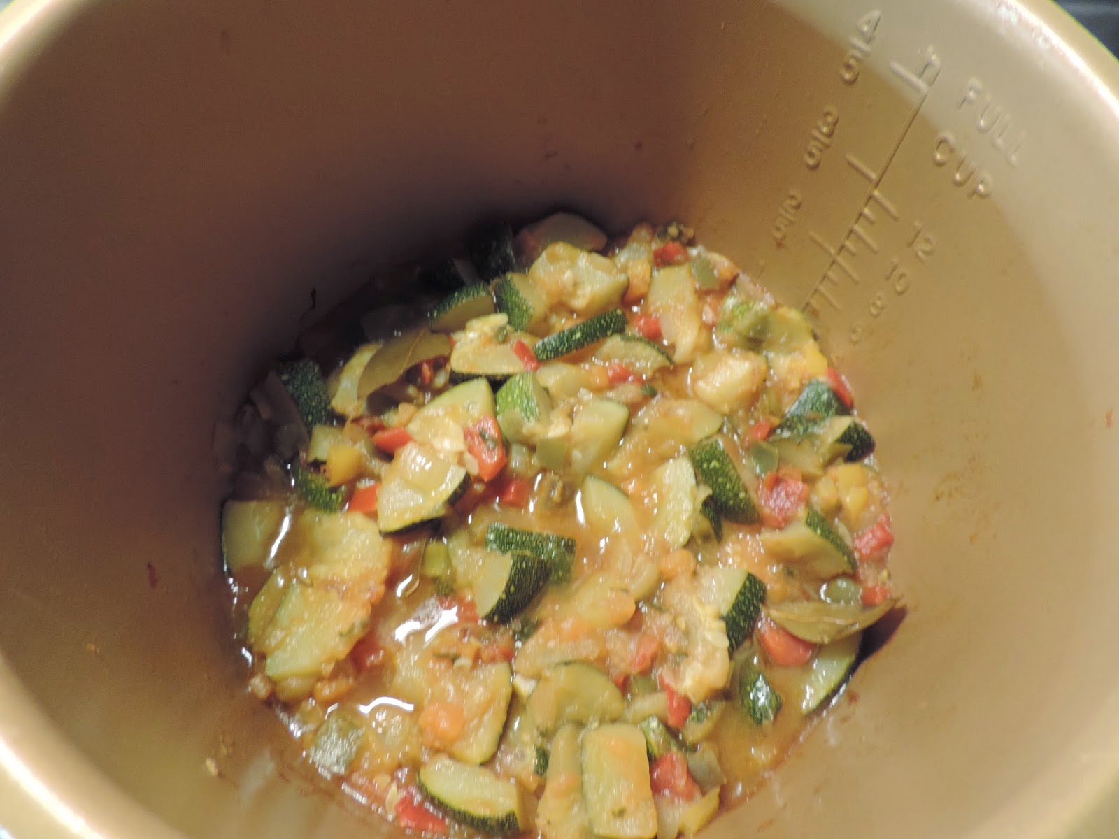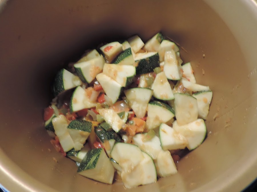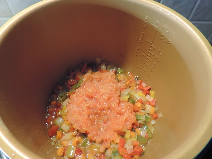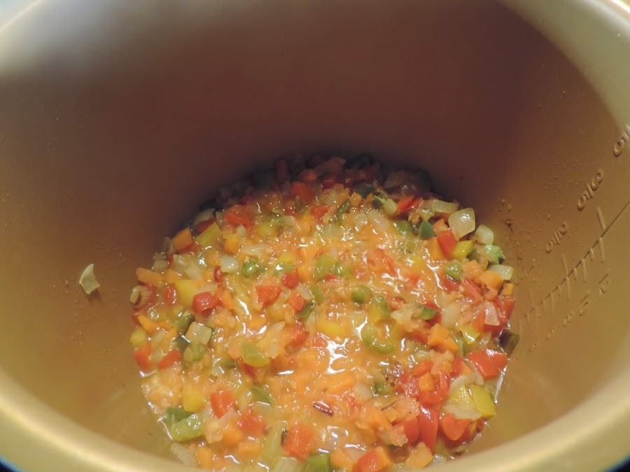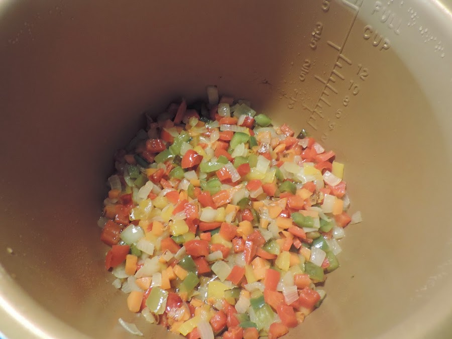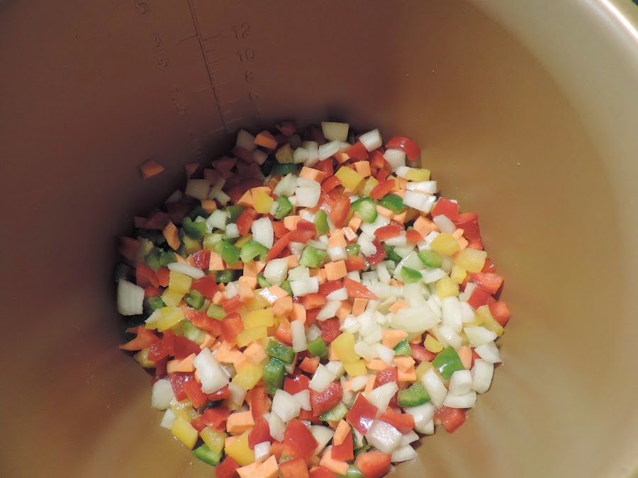Poner 4 cucharadas de aceite de oliva en la cubeta, añadimos los pimientos, cebolla y boniato.