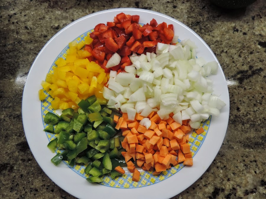Cortamos en trozos los pimientos, cebolla y boniato.