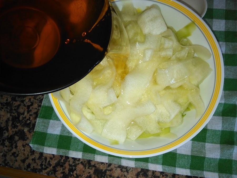 Una vez todo cortado añadimos el vinagre y el agua, con ayuda de un tenedor mezclamos bien y apretamos para que todo quede bien impregnado