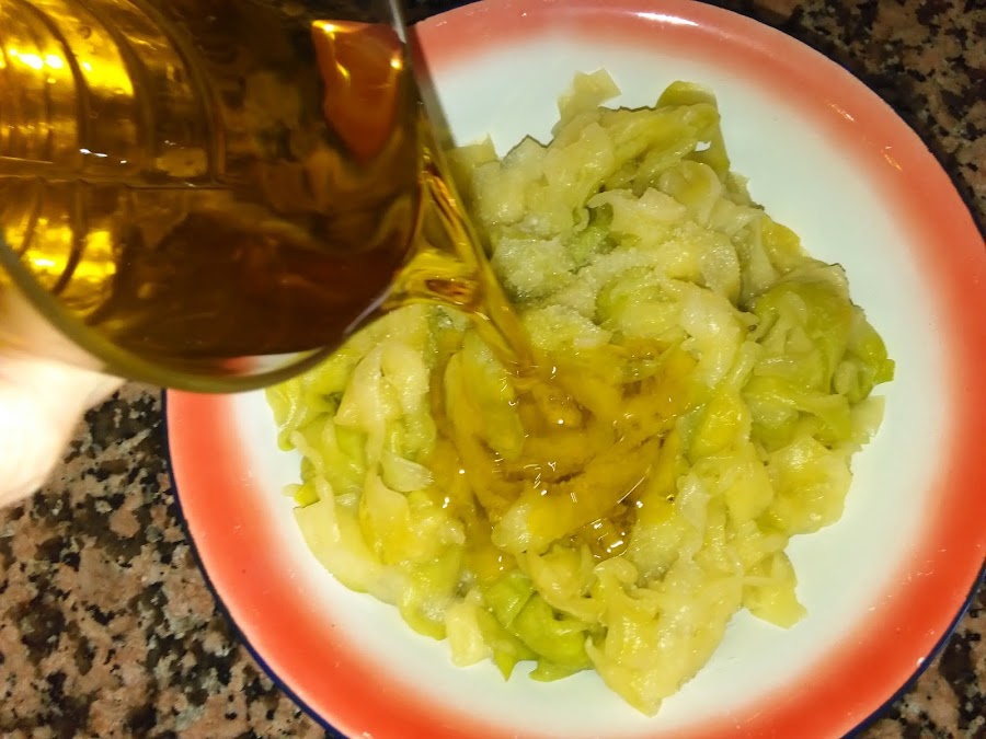 Una vez el calabacín bien escurrido se añade sal, el aceite (que quede bien impregnado) vamos removiendo todo bien