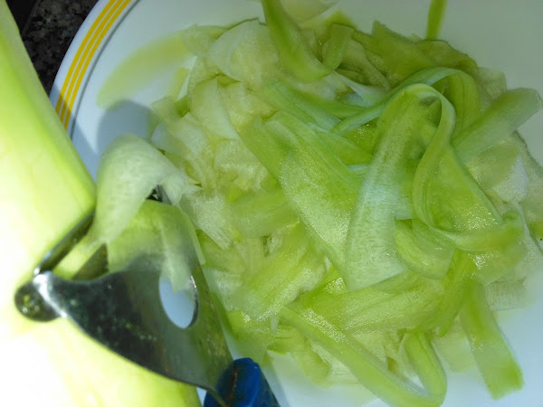 Cortamos el calabacín a la mitad y con ayuda de un pelador vamos sacando tiras, aprovechando bien todo el calabacín hasta llegar al centro