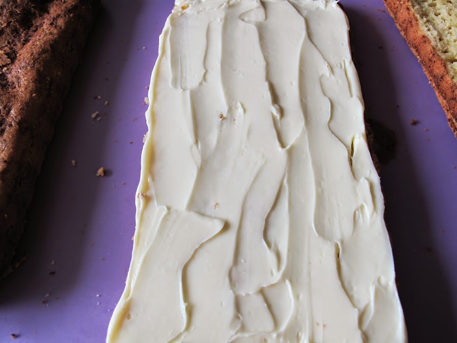 Partimos el bizcocho a la mitad (hice dos tartas) y luego abrimos los bizcohos al medio (en horizontal) para rellenar una de las partes con cobertura de chocolate, tapamos con el otro medio bizcocho y cubrimos con la cobertura de chocolate blanco. Decoramos al gusto con la piel de calabacín confitada.
