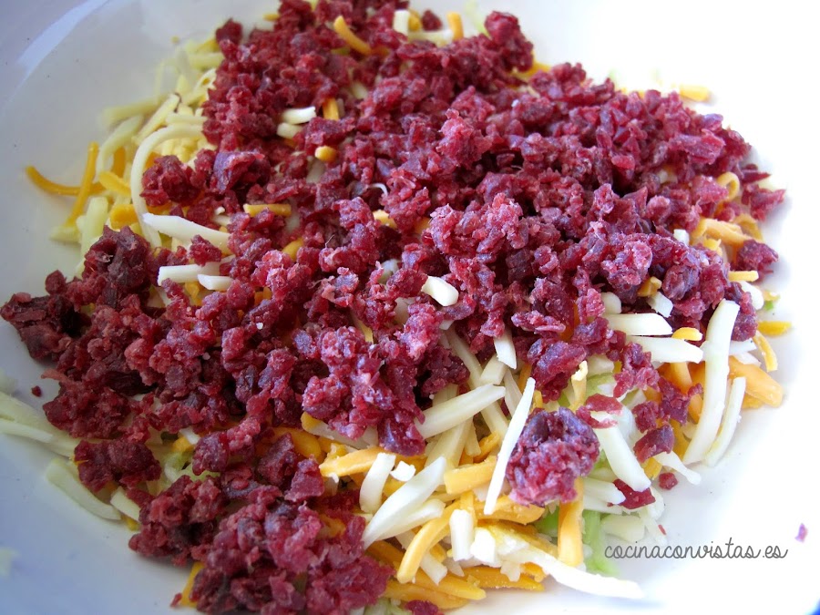 En un bol ponemos el huevo y lo batimos un poquito, añadimos el calabacín, el queso, la cecina, un poquito de pimienta molida, el tomillo y el pan rallado.
